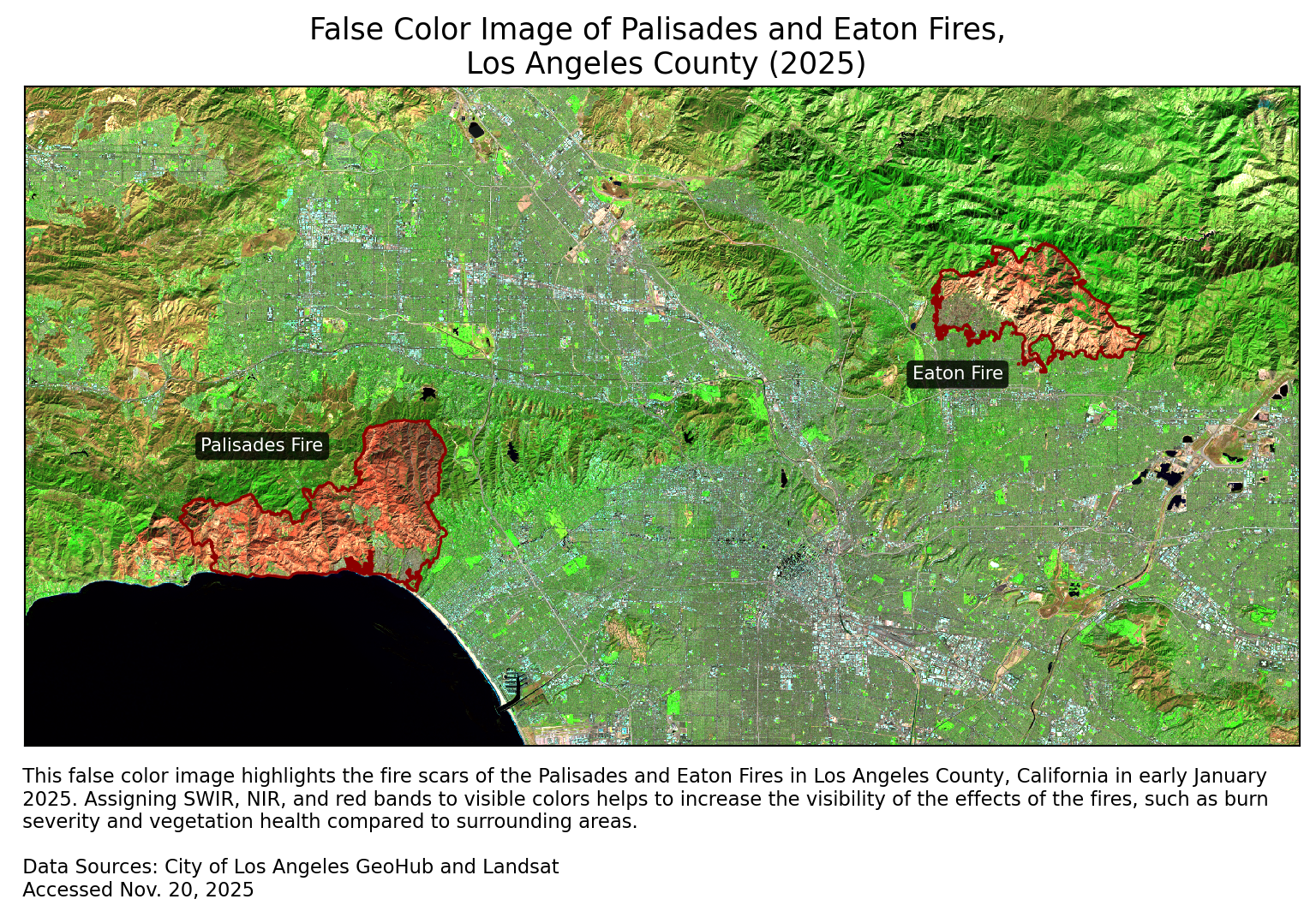 plt.figtext(0.12, 0.13, " This false color image highlights the fire scars of the Palisades and Eaton Fires in Los Angeles County, California in early January \n 2025. Assigning SWIR, NIR, and red bands to visible colors helps to increase the visibility of the effects of the fires, such as burn \n severity and vegetation health compared to surrounding areas.\n \n Data Sources: City of Los Angeles GeoHub and Landsat \n Accessed Nov. 20, 2025", fontsize = 8.5)