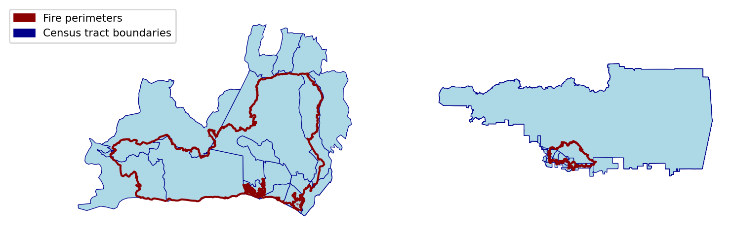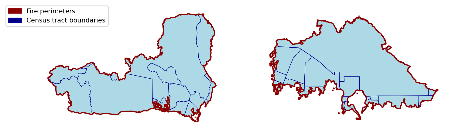To further reduce the census tracts to the fire perimeter boundaries, we will clip the census tracts to Palisades and Eaton fire perimeter using