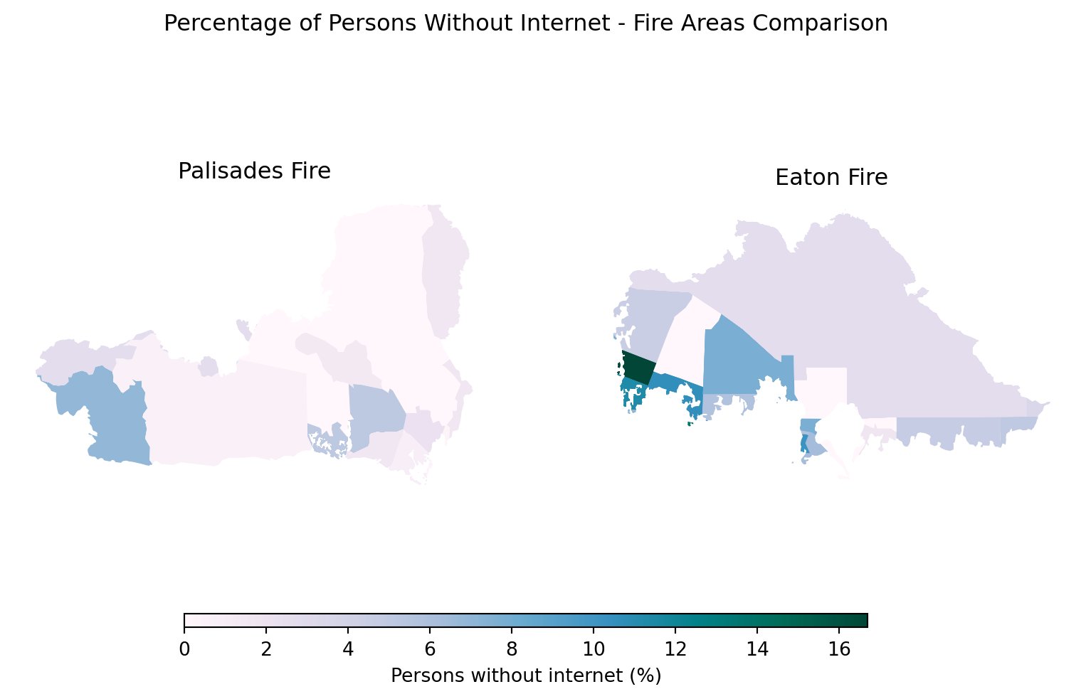 Based upon this map, we can see that some areas, especially within the Eaton Fire perimeter, had percentages of people without internet as high as 16%. Targeting these census tracts for wildfire resilience programs such as providing pre-planned courses of action when signs of fire are noticed or a list of places to notify using alternative methods in the case of a fire would be beneficial.
